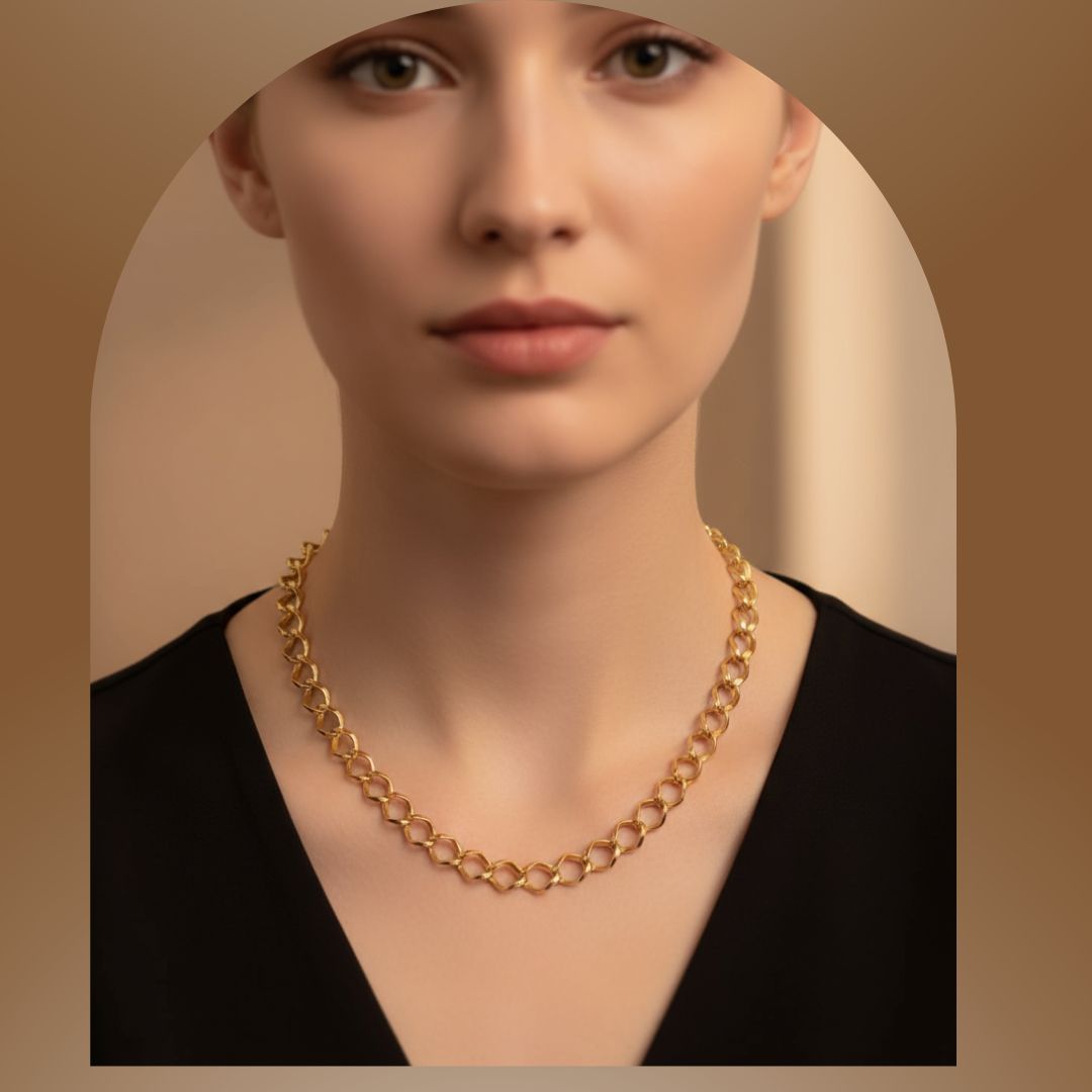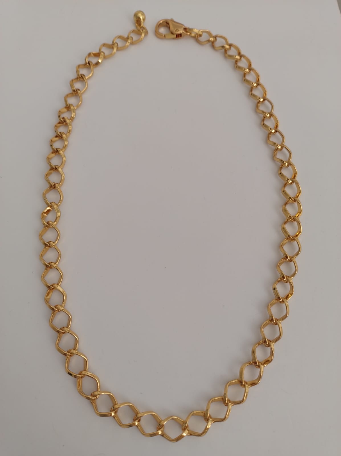 Colar com elos em formato de “oito” torcido, fecho tipo lagosta e corrente extensora com pingente esférico.